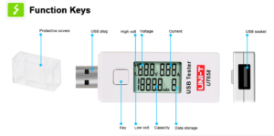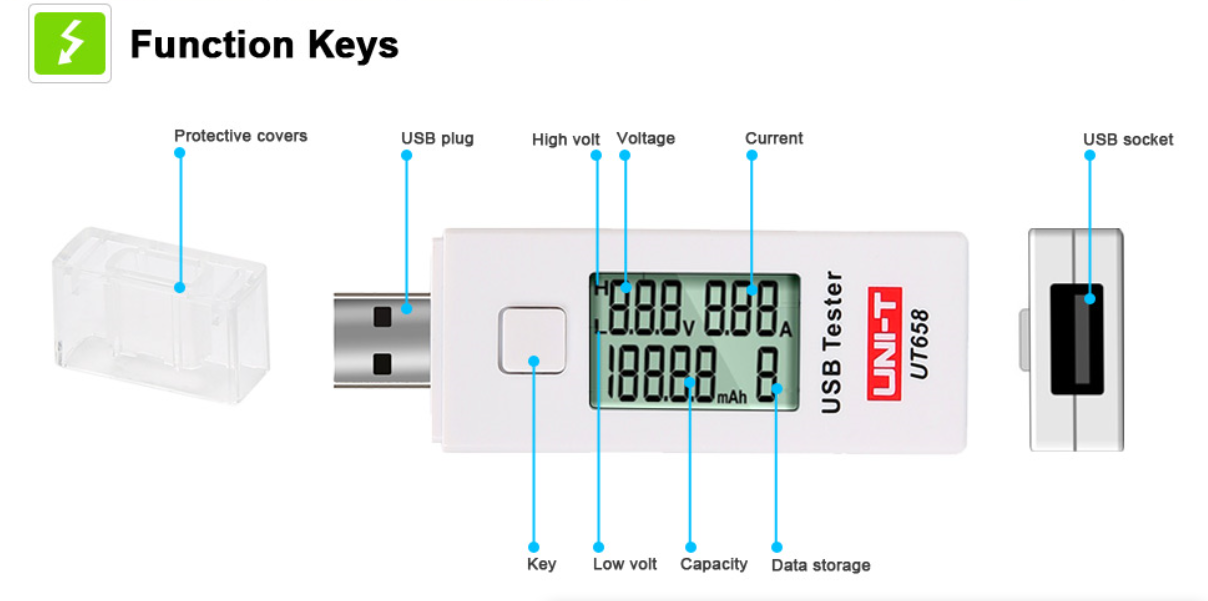 La chiavetta tester USB UNI -T UT658 può me3morizzare 10 misurazioni per vissualizzarle premere brevemente il tasto bianco e per cancellare I dati, premerlo a lungo.